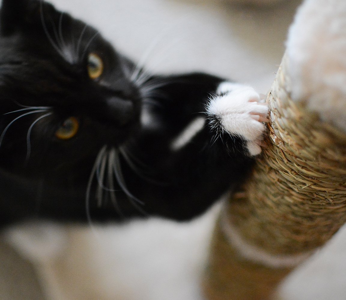 Kratzen spielen eine wichtige Rolle im Tagesablauf Ihrer Katze. Es ist eine großartige Möglichkeit für Ihre Katze, Muskeln zu dehnen, und eine erstaunliche Selbstpflegeroutine, wenn Ihre Katze ihre Krallen reinigen kann. Kratzen ist auch eine Möglichkeit, das Gebiet zu markieren, indem sowohl der Duft als auch visuelle Spuren zurückgelassen werden. Kratzen gibt Katzen Komfort und lässt sie sich wie zu Hause fühlen. Wenn Sie nicht möchten, dass Ihre Katze an Möbeln im Haus kratzt, stellen Sie ihr einen Kratzbaum zur Verfügung. Sie können Katzenminze oder ein Spielzeug verwenden, um Ihre Katze zu ermutigen, den Kratzbaum zu verwenden.